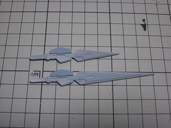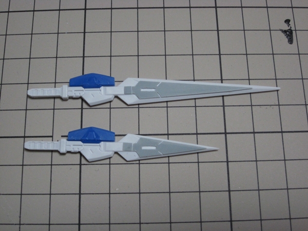HGのGNブレイドと見比べると、色分けもしやすそうだし、立体感もあってカッコイイので0.3mmプラバンを貼ってみました。